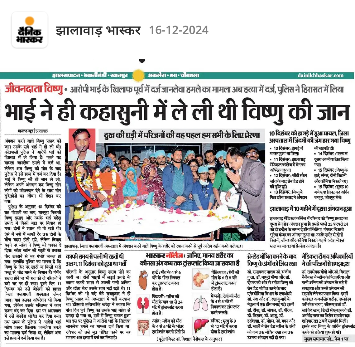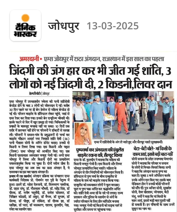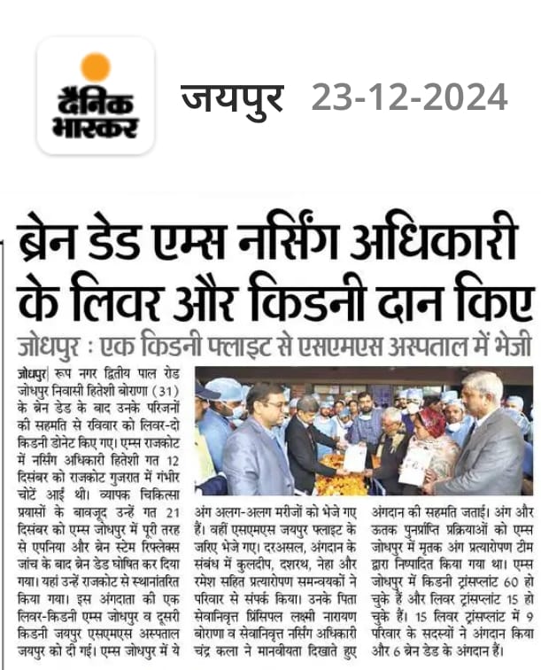 नारायणा अस्पताल जयपुर में हुआ प्रदेश का 59 वां अंगदान |