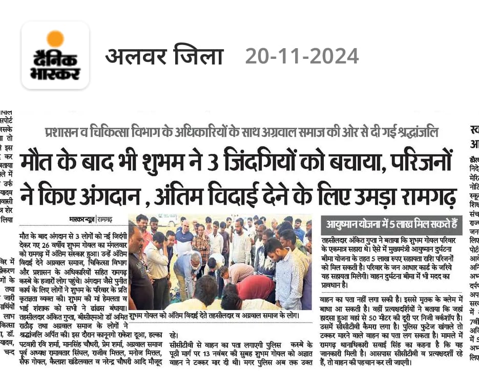 मरने के बाद भी 3 लोगों को जिंदगी दे गया अलवर का शुभम गोयल, डोनेट किए ऑर्गन |